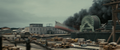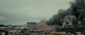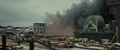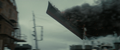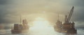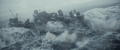 Half of an acoustic minesweeper being thrown by Godzilla near Hibiki