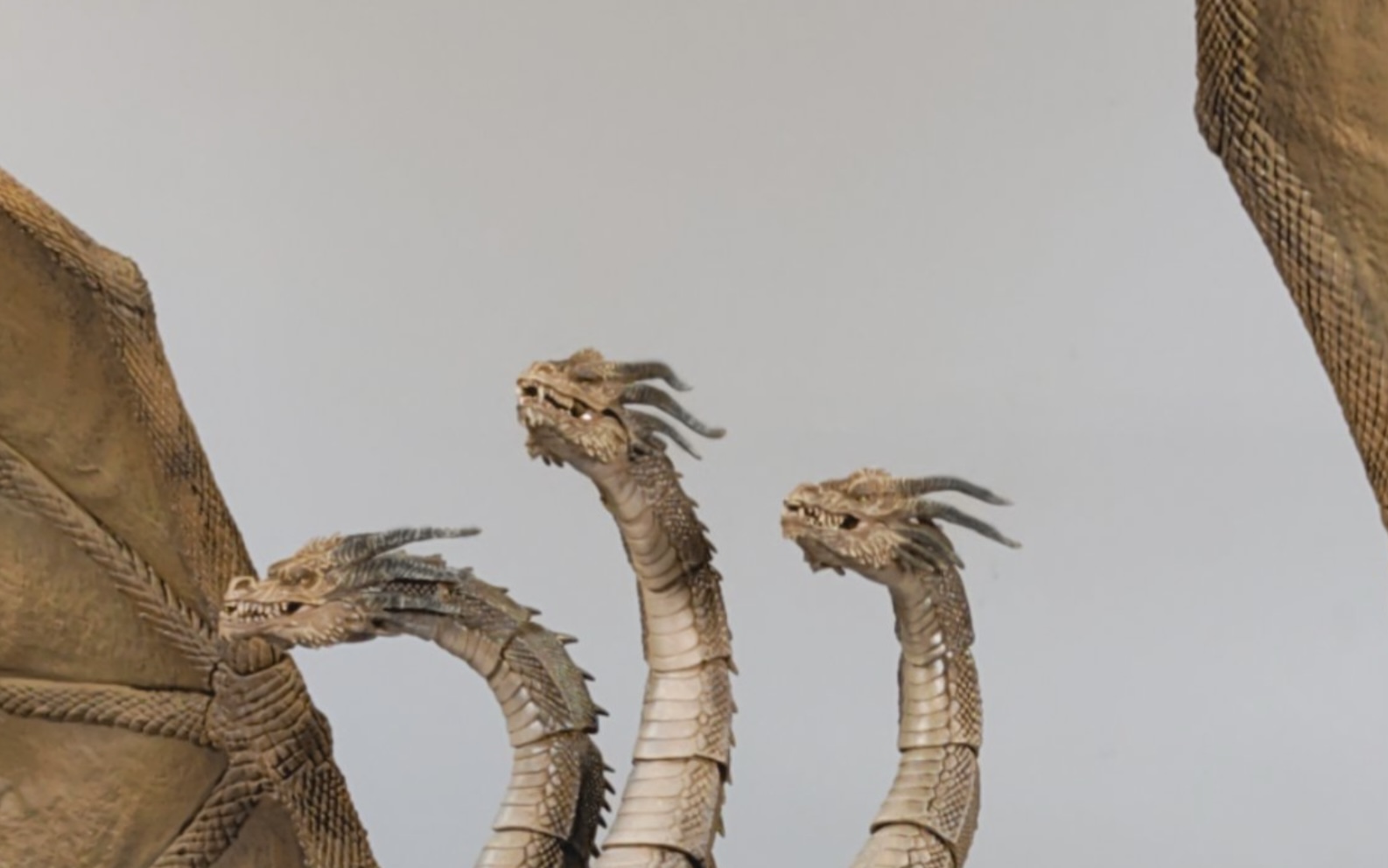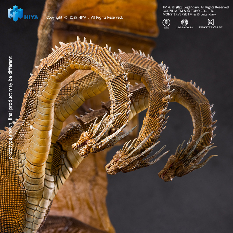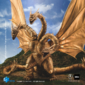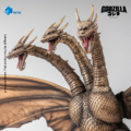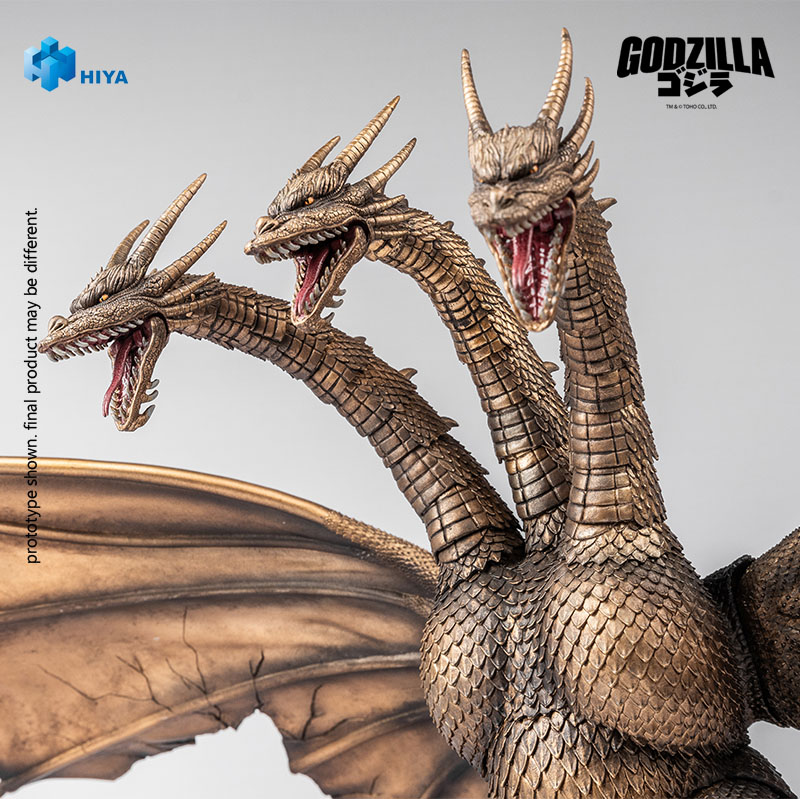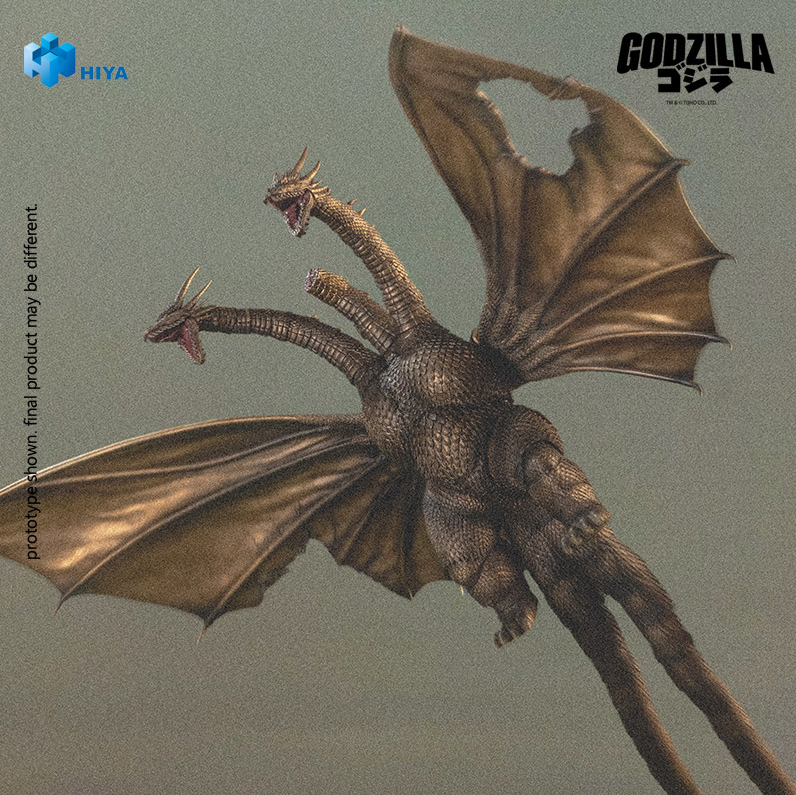 Hiya Toys teased the Exquisite Basic King Ghidorah figure on January 29, 2023, and fully revealed it on February 24. The figure is based on the character's appearance in Godzilla: King of the Monsters. It stands at 350 millimeters (13.8 inches) tall and has a wingspan of 560 millimeters (22 inches). Included are two stands to support its wings when outstretched.