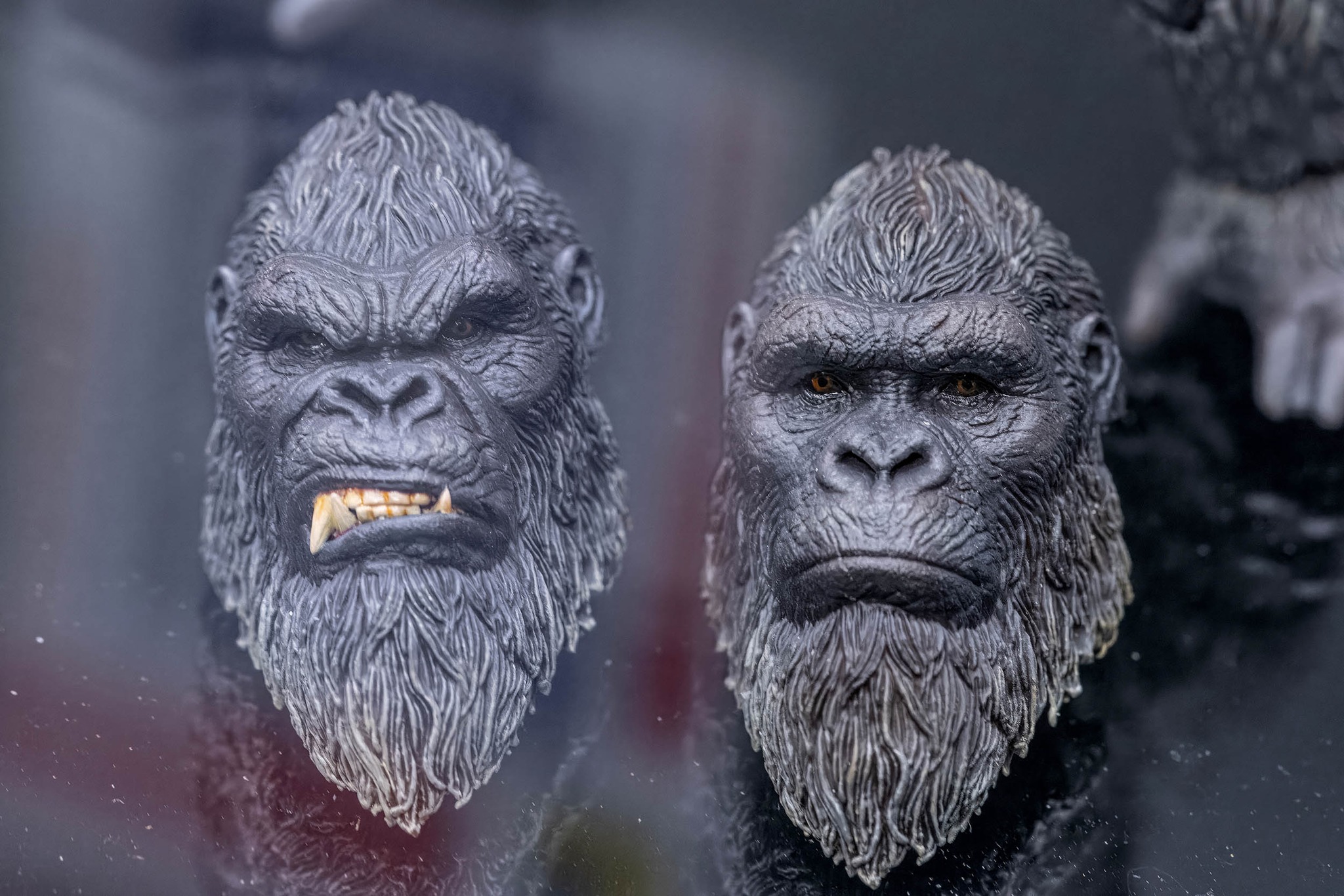The Exquisite Basic Kong figure, based on the character's appearance in Godzilla vs. Kong, stands at 6.3 inches tall with 16 points of articulation. Two alternate head parts and three hand pieces are included with the figure, as well as a battle axe accessory.