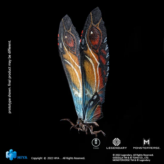 The Exquisite Basic Mothra figure, based on the character's appearance in Godzilla: King of the Monsters, has a 14.2-inch wingspan and 11 points of articulation. A base is included with the figure to display it in a flying pose.