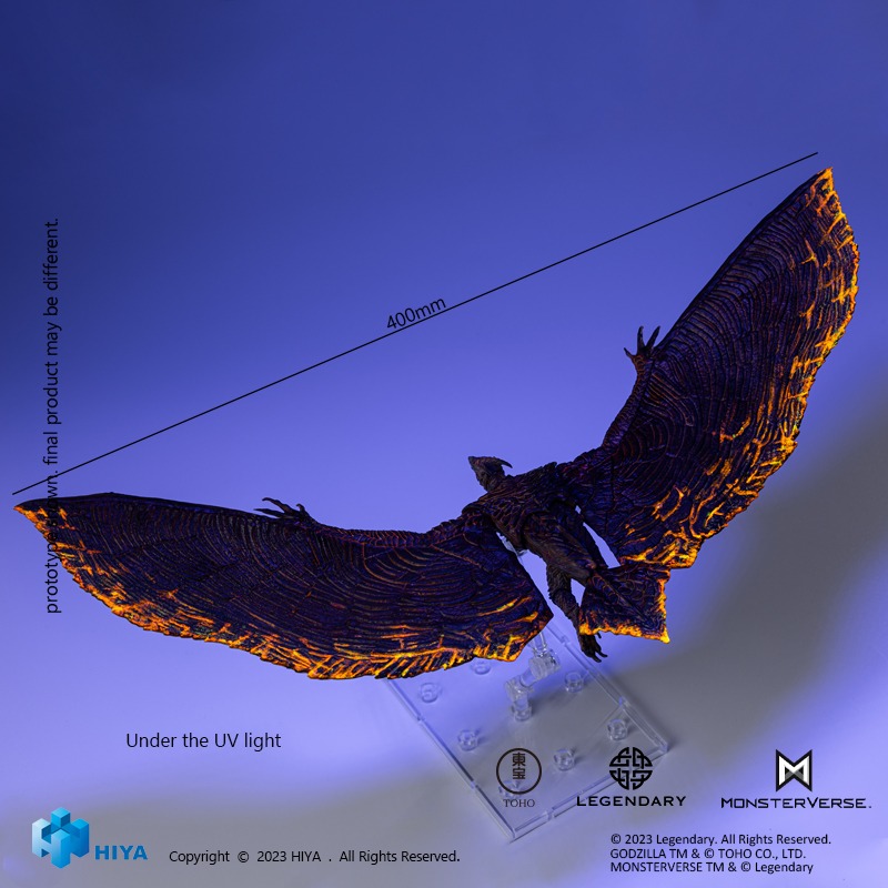 A repaint of the Hiya Toys Rodan was revealed on December 4, 2023. Its wings are applied with fluorescent coatings; under a UV light, a yellow glow emanates, vividly depicting the effect of molten lava.