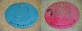 The Human-Signs are disc shaped, and colored to match the hero they transform (Human-Sign Blue being blue to correspond with Human No. 1, and Human-Sign Red being red to correspond with Human No. 2). Each one has an image of a Human mask, and just above it, a small hole is visible. A operator's finger or a rod would be put through said hole and spun during the show to transform the Humans.