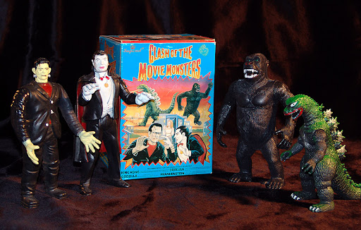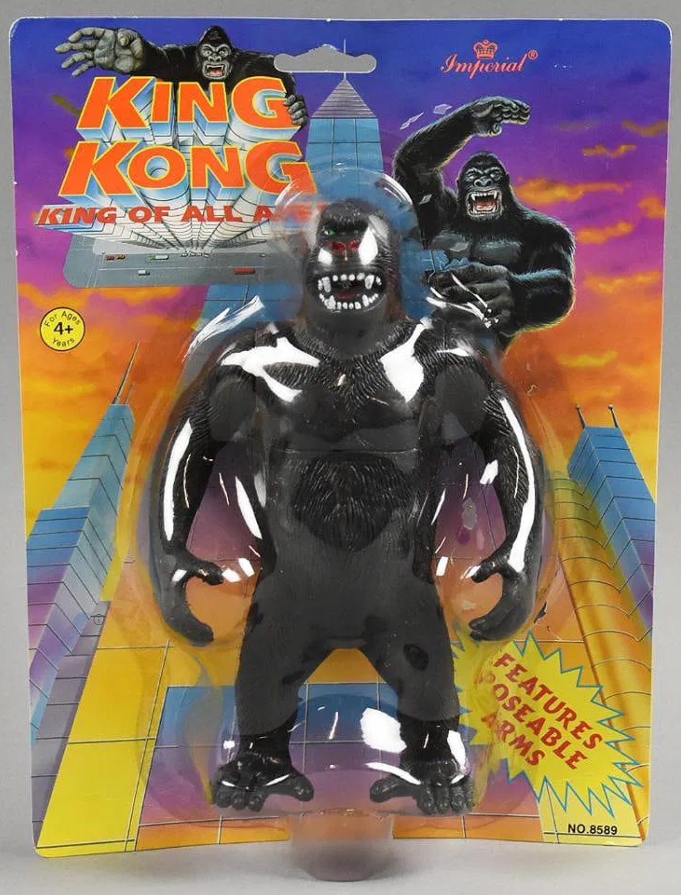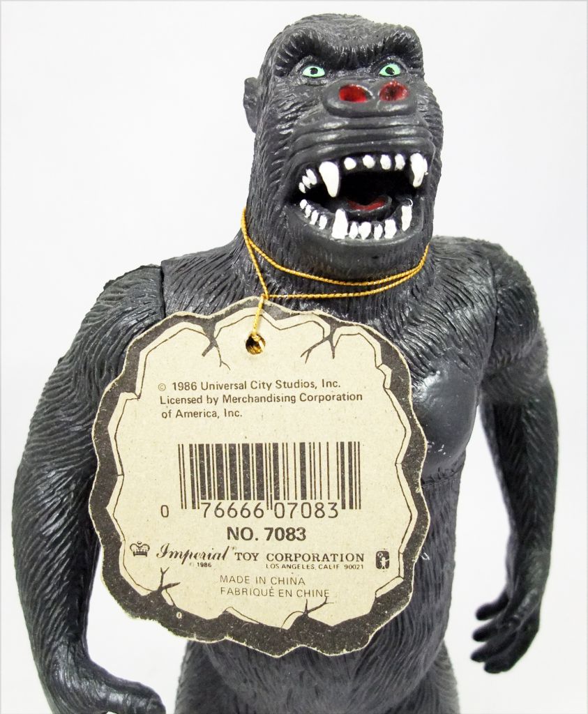 In 1986, Imperial Toys produced a line of King Kong toys labeled King Kong, King of All America. The King Kong figure was also released in a Clash of the Movie Monsters box set with Dracula, Frankenstein, and Godzilla.