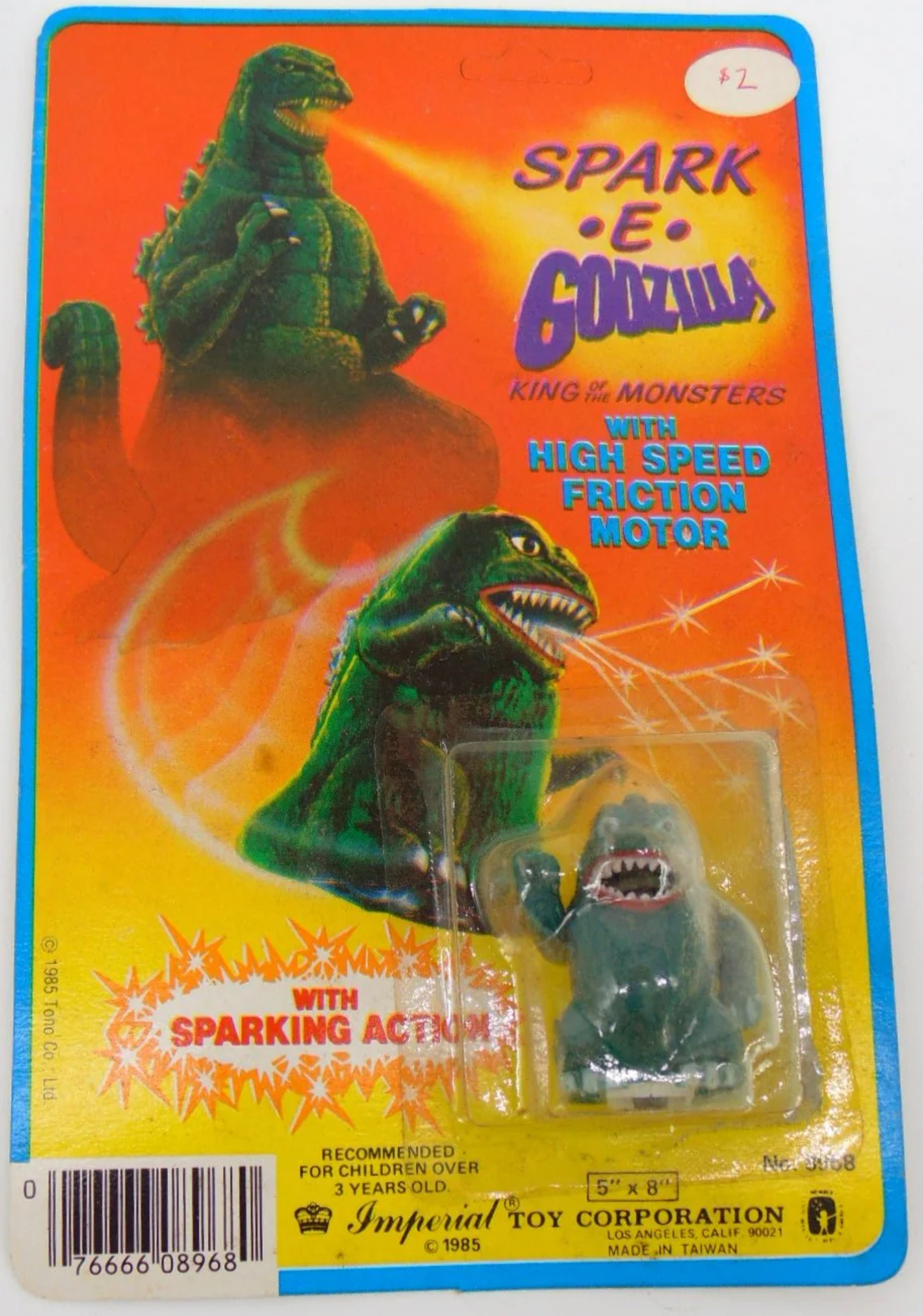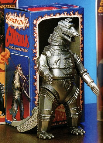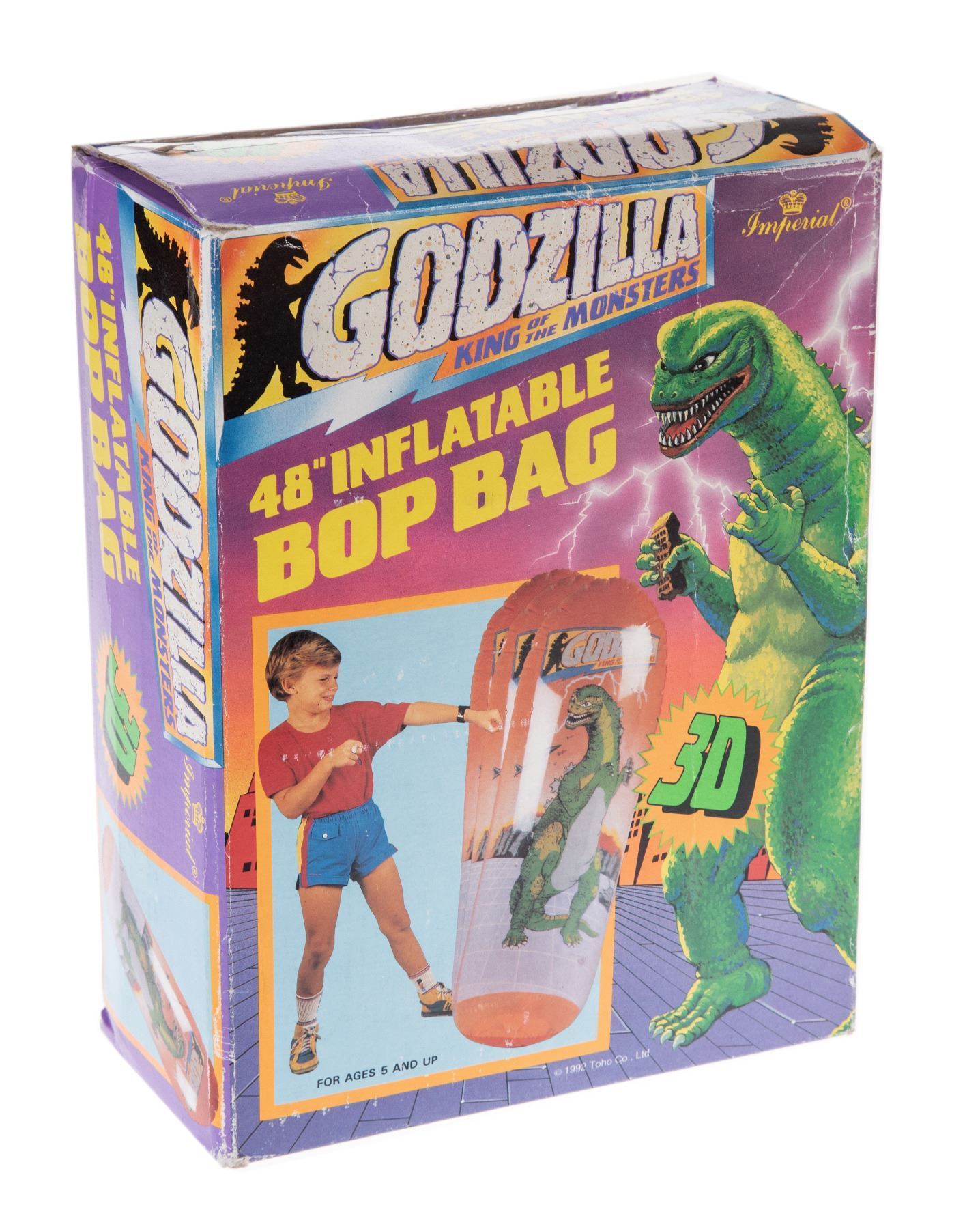 In 1985, Imperial Toys produced a Godzilla, King of the Monsters toyline. The line included 6-inch and 12-inch scale Godzilla figures, Bop Bags, bubble-blowing toys, and spark-shooting toys. A Sparking Mechagodzilla was showcased in a 1985 magazine advert, but it was ultimately unreleased. Imperial Toys re-released the toys in 1992.