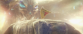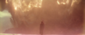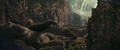 Once there, Kong hesitated to enter the Hollow Earth. Lind and Andrews asked Jia to sign to Kong that there might be others of his kind within the Hollow Earth, which convinced him to charge into the entrance. Jia and the others followed him within Apex antigravity vehicles called HEAVs, passing through the gravitational distortion and entering the vast underground realm. Two Warbats attacked the HEAVs, but Kong managed to dispatch them both. Eventually, he came upon a huge stone temple, with a door bearing the handprint of his species. Kong opened the door and entered the structure, finding it empty save for a giant throne and the skeletal remains of a fallen Titan, with a giant axe embedded in its skull. Kong lifted the axe and pounded his chest in triumph before seating himself upon the throne. The axe glowed with a blue aura, which Kong followed to a glowing pattern on the ground: the energy source that the expedition was seeking. Apex used a drone to harvest the energy and relay the data to headquarters in Hong Kong so that it could be copied. Andrews protested Apex taking the energy source for itself, prompting the company's guards to draw their guns on her, Jia, and Lind. Kong roared angrily just before Godzilla's atomic breath breached the temple, awakening the Hellhawks roosting on the ceiling. Jia, Andrews, and Lind escaped to a HEAV in the confusion, and followed Kong through the passage opened by Godzilla's atomic breath to Hong Kong.
