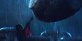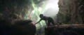In a scene set 11 months before the story's main events, a Sirenjaw attacks Jia's family as a perpetual storm ravages Skull Island. Her sister lifts her onto a tree before a rush of water sweeps her away. Kong takes notice of her and rescues her. Later, she recalls a story her elders told her of Godzilla or another of his kind "[eating] a star" in the Hollow Earth that turned him wicked and waging war against the Iwi and Kongs, ultimately forcing them to journey to the surface and take up residence on Skull Island.