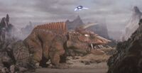 Jiger is a horned quadrupedal reptile with a large head and a small frilled crest, sharing many similarities in build with ceratopsian dinosaurs. Its skin is light brown and covered in circular patterns while a large red fin runs down the length of its back. Jiger sports multiple spikes on its face, including a large cranial horn, two nasal spikes, and large tusks. In the 1970 manga adaptation of Gamera vs. Jiger and the 2015 novel "Holy Beast War Chronicle: The White Shadow", it repeatedly stood upright.[14]