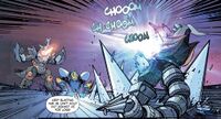 Psycho Ranger Hedorah struck first, lobbing corrosive sludge at the Megazord while Psycho Ranger Gigan sliced into the White Ranger's Tigerzord. The Dragonzord was not safe from their wrath, either, with Psycho Ranger Megalon using his drill arms to charge into the Zord. Godzilla attempted to fight back by blasting Psycho Ranger SpaceGodzilla with his atomic breath, though the latter deflected the blast with a telekinetic shield. Godzilla and the Dragonzord managed to land hits on their respective foes, though Psycho Ranger King Ghidorah and Psycho Ranger Destoroyah employed energy weapons against the lot. As Jet Jaguar located and rescued a group of Power Rangers from this alternate universe, the Kaiju Psycho Rangers easily overwhelmed their opponents, with Psycho Rangers Hedorah and Gigan smothering the Tigerzord as Psycho Rangers SpaceGodzilla and Megalon simultaneously tore through the armor of the Dragonzord. Once the alternate-universe Power Rangers were safe, Jet Jaguar used the Multiversal Focus fragment to teleport his allies to another reality, hoping to lose the Kaiju Psycho Rangers in the reality stream.