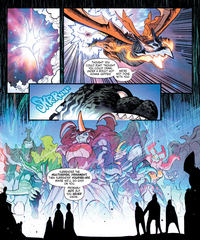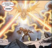 Despite their best efforts to shake off their adversaries, the recovering Power Rangers were ambushed by the Kaiju Psycho Rangers mere minutes later as they attempted to recuperate on Infant Island. Fortunately, the Elias, Queen Mothra, and Godzilla came to their aid, attempting to fend the monstrous foes off. Godzilla fired his beam at Psycho Ranger King Ghidorah, only to come under attack from Psycho Ranger Gigan, who sliced into Godzilla's arm while Psycho Ranger Destoroyah pursued Mothra in the air and clawed at her face. Before the Kaiju Psycho Rangers could capture or defeat their opponents, Jet Jaguar teleported the group away yet again, saving both the Power Rangers and their various allies in the process.