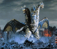 After his transformation, Keizer Ghidorah also engaged in a beam-lock with Godzilla, his antigravity beams easily overpowering Godzilla's atomic breath. Keizer Ghidorah then repeatedly attacked the outmatched Godzilla with his antigravity beams, tossing him across the ruins of Tokyo like a rag doll. Eventually, Keizer Ghidorah approached the fallen Godzilla and kicked him repeatedly in the head before lifting him into the air and draining his energy through his bite. The crew of the Gotengo saw Godzilla losing his energy to Keizer Ghidorah, and Shinichi Ozaki used the ship's Maser Cannon to transfer some of his Keizer energy into Godzilla. Godzilla was immediately re-energized and released a shockwave of energy, breaking him free from Keizer Ghidorah's grip. Keizer Ghidorah tried to retaliate with his antigravity beams, but Godzilla blasted off his middle head with his atomic breath and caused one of Keizer Ghidorah's antigravity beams to sever another head. Godzilla then tossed the maimed Keizer Ghidorah over his shoulder by the beast's remaining neck. Finally, Godzilla threw Keizer Ghidorah into the air and blasted him with his red spiral ray, pushing Keizer Ghidorah into space and causing him to explode.
