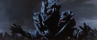 In Godzilla Final Wars, Monster X was eventually outmatched by Godzilla prior to the destruction of the Xilien Mothership. Earlier in their battle, Monster X screeched in pain when Godzilla tricked Gigan into slashing him with his Bloody Chainsaws. Similarly, Godzilla quickly pinned Monster X in Godzilla: Rage Across Time, although the distraction presented by the Xilien fleet allowed the alien to triumph.