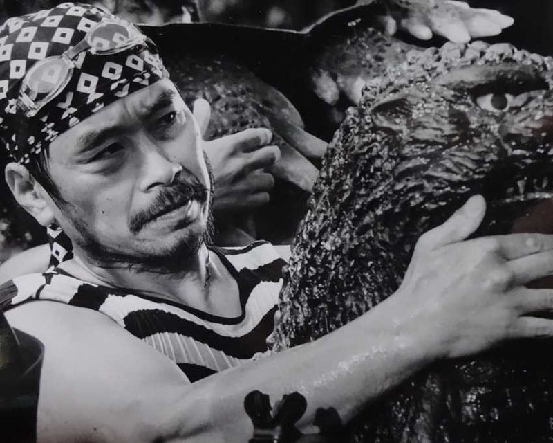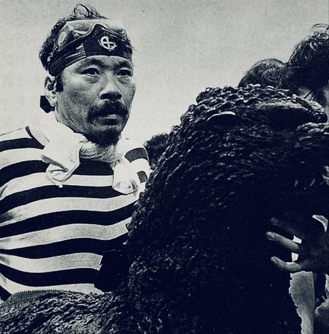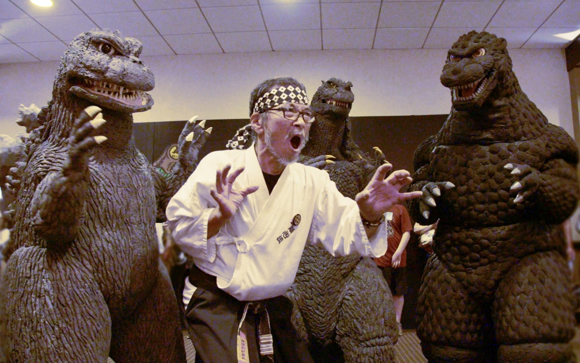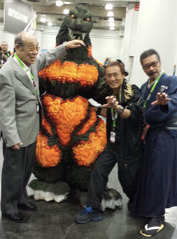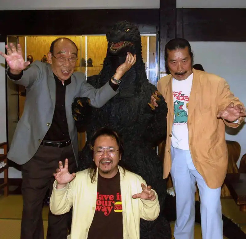 Kenpachiro Satsuma alongside fellow Godzilla suit actors Tsutomu Kitagawa and Haruo Nakajima