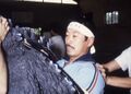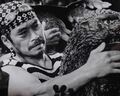 Satsuma shakes hands with "Hurricane" Ryu Hariken on the set of Godzilla vs. King Ghidorah