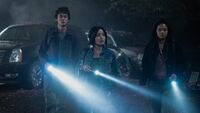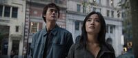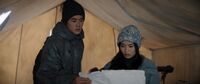 That night, Caroline payed off a guard to avoid having the inside of the truck inspected before releasing Cate, May, and Kentaro in a secluded area. Looking at the wreckage, Kentaro asked how anyone could believe G-Day was a hoax, to which Cate responded that for some people, it was easier than accepting this devastation could happen to them too. Caroline and James left them with supplies, warning them to avoid being caught and to be back by morning. Cate experienced multiple flashbacks to G-Day as she walked through the ruins of her neighborhood, narrowly escaping a military patrol. Hoping to ease Cate's distress, Kentaro had her reminisce about their father along the way, though another patrol soon spotted them and chased them into a BART station, where Cate's flashbacks started to get the better of her. While exploring underground, they reached a dead end, which caused Cate to begin panicking; May helped her control her breathing, soothing her while Kentaro located a way out and led them to the surface. They soon made it to the Transamerica Pyramid and located of Hiroshi's office. Kentaro hoped to find a safe behind a map on the wall as they did in Tokyo, but found nothing. Looking at the map itself, Cate realized the lines drawn on it were not satellite paths, but something else. Browsing Bill's files on May's tablet, she located a similar map. Drawing on the theme of projected images from his first art installation, Kentaro copied the points on Bill's map to a piece of paper, then poked holes in it and held it up against the rising sun, where the light revealed locations of interest on Hiroshi's map. Cate identified dots aligning with Alaska and San Francisco while May located another in Africa: their next destination if they are to follow the path Hiroshi took. They left with the map and returned to the van just before daybreak, with Kentaro revealing he was feeling optimistic about the future. "The Way Out"