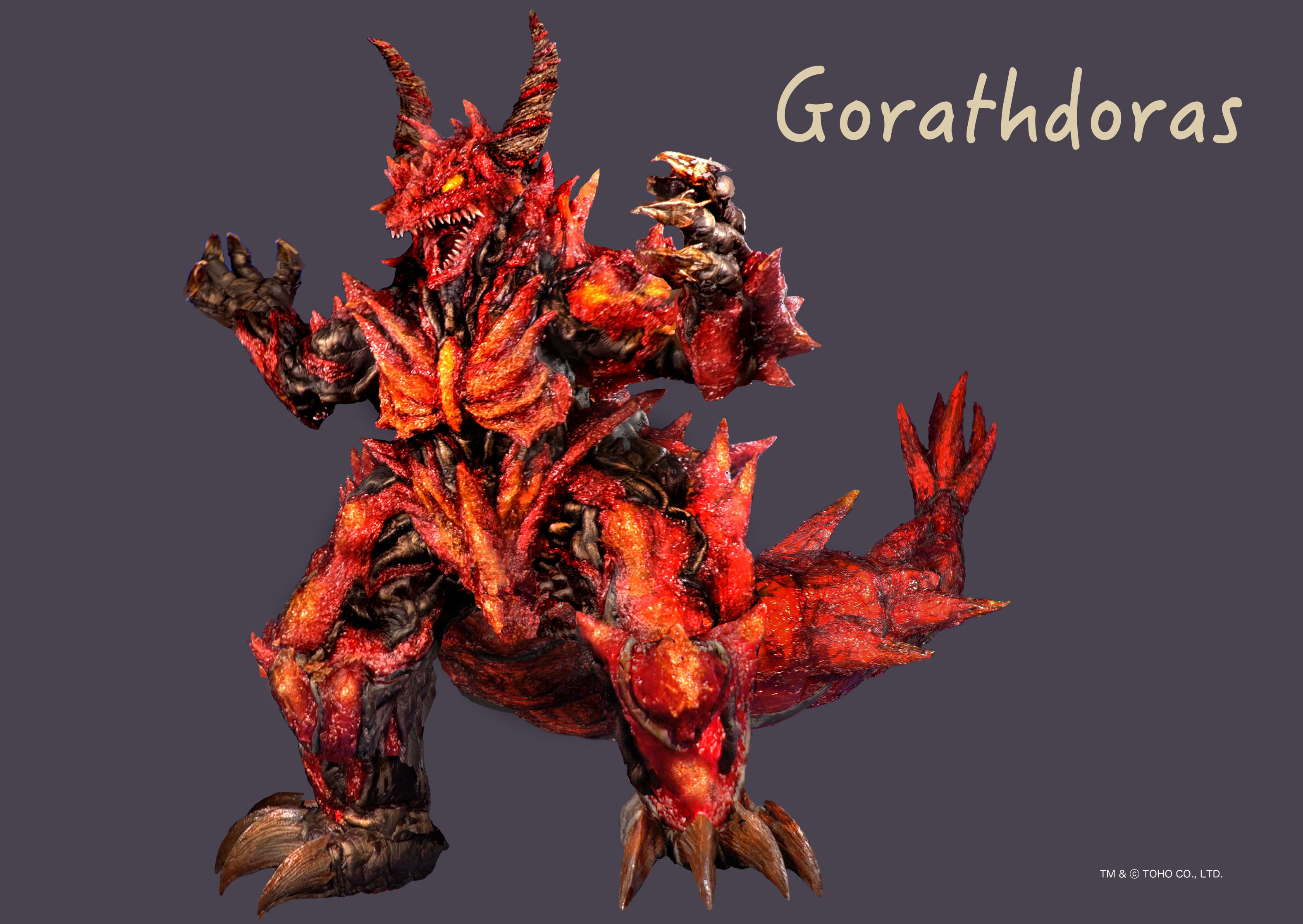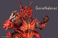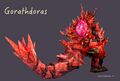 The kaiju sports a markedly different design as Gorathdoras, possessing a noticeably stockier build with a bulkier body, thick legs and arms, and no wings. Its body is largely black and covered with red and orange, spikey, armor-like protrusions. Its eyes are larger than those of Kilafadoras, and are a plain orange color. It sports a thin, pointed snout and two massive horns. The Gorazynium crystal heart of Gorath protrudes from its back.