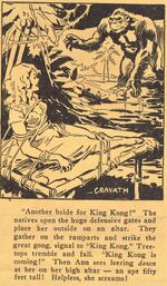 King Kong was first discovered on Skull Island by an American film crew led by Carl Denham. The natives on the island kidnapped Ann Darrow, the crew's leading lady, and sacrificed her to Kong, who they treated as a type of god. They tied her to two pillars on a moveable platform and took her to the other side of a wall they built to keep Kong out. After the gates closed, the tribesmen climbed to the top of the wall to finish the rites and watch the spectacle about to unfold. The chief called for silence and gave a prayer to his god that he would accept the sacrifice. Two men banged a massive gong. The rest of the natives repeated the last words of the prayer. The gong rang again. Suddenly, a growl could be heard in the darkness. Something was stirring in the nearby trees. To Ann’s horror, from the canopy emerged a gigantic 50-foot ape. It was Kong, the god of Skull Island. Ann screamed in terror while Kong stared at her smiling, curious and entranced by her. He tore off the vines Ann was tied to and held her in a tight grip with his hand, causing her to scream even louder. After roaring angrily at the tribesmen on the top of the wall, Kong went off into the dark jungle, taking Ann with him. At one point, Kong left Ann on a tree and wandered off to deal with the rest of the film crew, who were pursuing him. As the crew attempted to cross a chasm on a crude log bridge, Kong lifted the log and twisted it, causing much of the crew to fall to their deaths into the abyss below. Jack Driscoll hid in a cave at the edge of the chasm, but Kong found him. However, Kong’s grip was just out of reach, and when his fingers got too close Jack stabbed him with his machete. As Kong continued to reach for Driscoll, the sailor saw a large lizard crawling up a vine that led into the cave. Luckily, Jack was able to cut the vine and get back out of Kong’s reach. Meanwhile, a huge theropod dinosaur discovered Ann on the tree and attempted to eat her. Kong gave up on Jack and ran back to the tree to battle the predator. Kong arrived just in time and wrestled with the dinosaur, avoiding his bites with swift dodges and by closing his jaws. He was able to tire the theropod, giving him the opportunity for the killing blow. Kong jumped up on the creature’s back and began to break its jaws. The predator continually got out of Kong’s grip, only for Kong to regain it. Eventually the dinosaur became weakened and Kong was finally able to fully break its jaws. Ann, who fell with the tree during the fight, tried to escape. However, Kong easily grabbed her back into his hand and then continued his journey through the rainforest. Jack climbed out of the cave at the edge of the chasm and continued his pursuit. Kong took Ann to his home in a cave on a mountain, where he placed her on a small ledge in one of the walls. Kong went to a nearby lake in the cave to drink. A giant serpent-like plesiosaur began to slither up the walls to the ledge Ann was left on, and when she noticed it she screamed. Kong immediately rushed to her aid. The plesiosaur gave Kong multiple bites and continually tried to strangle him, almost succeeding at one point. Luckily, Kong was able to get out of its grasp, grabbed it by the tail, and beat it against the cave wall. After inspecting to make sure the creature was dead, Kong roared victoriously and once again grabbed hold of Ann, climbing out of the cave onto a large cliff. Kong set Ann on the ground and looked over Skull Island like a king inspecting his kingdom, and let out a massive roar to display his dominance. Overcome with fear, Ann fainted. Kong grabbed her again and began to tear her clothes. This caused Ann to wake up, and horrified, began desperately to try to get out of Kong’s grasp. Kong, amused, began to tickle her, terrifying her even more. Jack reached the cave but accidentally caused a large boulder to roll down. This got Kong’s attention and he went back inside to inspect the noise. Jack quickly hid behind a large rock before King could find him. As Kong continued to search for Jack, Ann meanwhile was attacked by a Pteranodon. Kong hurried back to the cliff when he heard her screaming and tried to fight off the creature. Jack reunited with Ann, and the two managed to escape from Kong while he was distracted by the Pteranodon. Enraged, Kong followed the two to the natives' village, tearing down the wall and wreaking havoc. Despite the natives' best efforts, they could not kill the massive ape with their primitive weaponry. Along with smashing many huts, Kong killed many natives with debris, tossing them around, crushing them, and biting them in his mouth. Using a store of gas bombs he brought on the voyage, Carl Denham and his crew managed to knock Kong unconscious and subdue him.