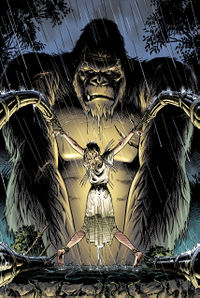 On finding humans in his jungle, Kong roared, which frightened Ann Darrow and caused her to scream. In an attempt to quiet her, he picked her up and at some point left her in a clearing before going to shake her rescue party off of a log. On returning to Ann, he found three Vastatosaurus rexes menacing her. He fought them off, and grabbed Ann, who was fleeing an Arachno-claw and decided he was tired of wandering the jungle and headed home. On the way, he considered his place as the last of the "great gorillas", and how alone he was before roaring and heading to his mountain lair. There he found a swarm of Terapusmordax, and began to fight them. Ann then began to slip away down a vine and Kong started to reel her back up before she somehow escaped.