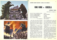 - A longstanding urban legend first published in the American magazine Spaceman #7 in 1963 claims that Kong is only the victor in the American version of King Kong vs. Godzilla, while Godzilla was allegedly victorious in the original Japanese version.[10] This claim is unfounded, as Kong is the only monster to surface from Sagami Bay in both versions of the film, while the actual differences between the endings of the two versions are minimal. Toho's 1963 international sales brochure makes it clear that Kong was intended to be the victor in the original version of the film, stating "A spectacular duel is arranged on the summit of Mt. Fuji, and King Kong is victorious."[11] Despite this, the double ending myth still perpetuates popular culture to this day, while the outcome of the battle has seemingly been retconned into a draw by Toho, as first indicated in Tomoyuki Tanaka's book Definitive Edition Godzilla Introduction.