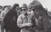 Shoichi Hirose, wearing the Kong suit, confers with Eiji Tsuburaya before filming of the kaiju's attack on Tokyo