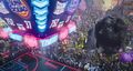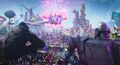 Following the Tune Squad's "upgrades" into computer-animated models, Al-G Rhythm announced the audience's arrival. King Kong was amongst the flood of Warner Bros.-owned characters that arrived at Looney Tunes World to watch the basketball game, settling into half of the seats surrounding the altered basketball court. He beat his chest and flailed his arms in glee as Al-G Rhythm brought in humans from the real world to fill in the rest of the seats. When LeBron scored the first point for his team, King Kong's jaw dropped as he witnessed the slam dunk, smiling in glee as the Tune Squad celebrated. During the transition into the game's third quarter, King Kong applauded, doing so again as the broadcasters discussed the game shifting in favor of the Tune Squad. When LeBron made amends with his son Dominic, who Al-G had tricked into an alliance, King Kong happily cheered as they embraced. Before the final quarter of the game started, Al-G Rhythm boasted, "King Kong ain't got nothing on me," to Kong's annoyance. Crossing his arms and sitting up straight, King Kong looked away and pouted before looking back at the algorithm with one eye. After LeBron scoring the winning point for the Tune Squad, King Kong fist-bumped with the Iron Giant in celebration of the team's victory. In the end, King Kong and the rest of the Serververse audience were transported off Looney Tunes World as everything returned to normal.