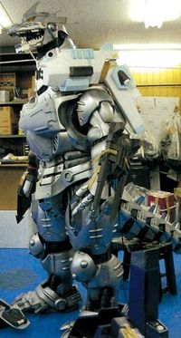 A 40 centimeter, 1/5-scale model of Kiryu with a detachable back unit was created as reference for the construction of the mecha's suit, based on Nishikawa's finalized design.[13] It makes a cameo in the film itself on a table in the Defense Agency of Science & Technology.[13] A team of modelers from Startrain, supervised by Shinichi Wakasa, created the suit.[13] For stunt sequences too difficult to execute through suitmation, 1/2-scale Kiryu and Godzilla models were created.[13] They appear in at least two scenes: Kiryu's King Kong vs. Godzilla-esque tail swing, for which they were attached to a spinning base, and the monsters' plummet into the ocean.[13] A highly-detailed CG model of Kiryu's suit was also employed for several shots during his transport and descent into Shinagawa to create movement which was impossible for the suit or scale model.[13] The close-ups of Kiryu's jet boosters in this scene were also purely CG.[13]