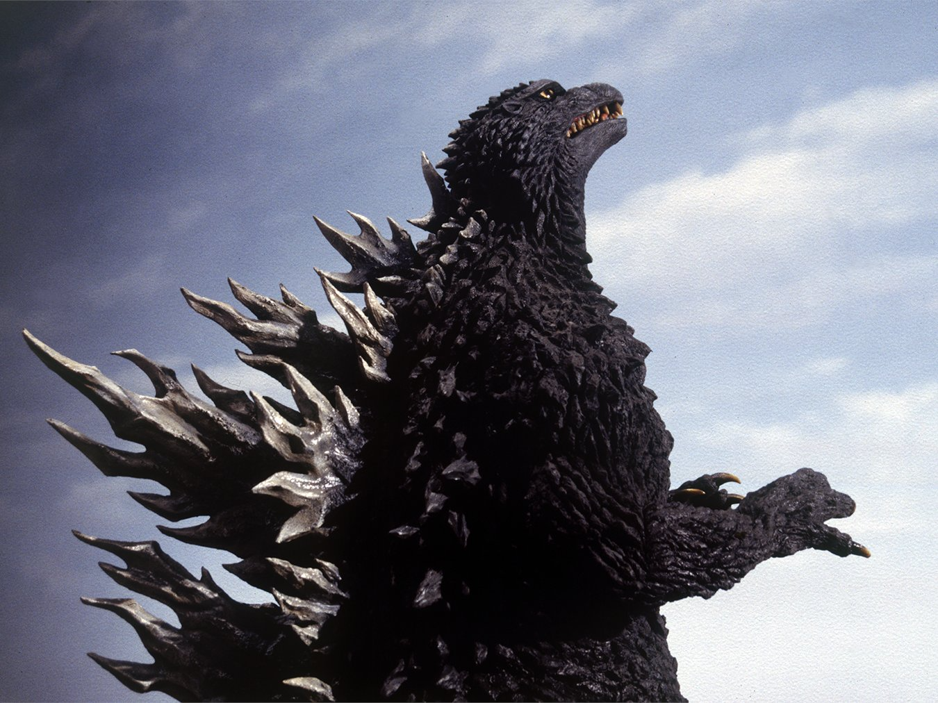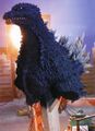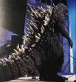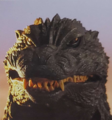 For the film Godzilla Against Mechagodzilla, Toho decided to stray away from the GMKGoji design Godzilla sported in the previous film and return to the look of the MireGoji. This new design, dubbed the KiryuGoji, did however undergo some major changes from those two previous designs. The head was completely changed and made smaller to the point of resembling the head of the Heisei series Godzilla. The suit was given large yellow and almost bird-like eyes. The dorsal fins were reduced a bit and lost their purplish hue, retaining the classic bone-white color, but still remained jagged like the MireGoji's dorsal fins. Godzilla's skin also returned from the green hue of the MireGoji to the traditional charcoal-black color.