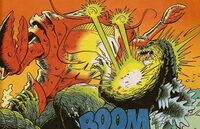 The loathsome, lobster-like leviathan fired its optic lasers at Godzilla and struck the gruesome gargantuan across the face. Retaliation came in the form of Godzilla's atomic ray, but the malicious monstrosity rose and slammed its foe into the Sydney Opera House. The immense invertebrate continued to push its adversary into the heart of the city, knocking him to the ground, but Godzilla countered with a swing of his tail, sending his opponent off-balance. Taking advantage of the situation, the thundering theropod blasted his foe into a building, and slammed its head with a train. The contemptible crustacean gripped Godzilla's neck, and began to continually blast the beast with its eye lasers. Godzilla roared in agony, and it seemed as though the King of the Monsters was about to be dethroned; however, the powerful colossus managed to procure in his claws one large pincer and tear it from the thorax of the Lord Howe Monster, killing the beast. Victorious, Godzilla returned to the sea, leaving his latest victim dead in his wake.