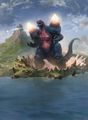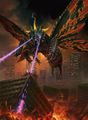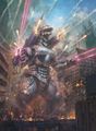 Magic: The Gathering, often shortened to just Magic, is a collectible card game created by Richard Garfield and published by Wizards of the Coast in 1993. The first of its kind, its popularity has only grown, with an estimated 35 million players worldwide in 2018.[1] On April 2, 2020, Wizards of the Coast announced that their upcoming Ikoria: Lair of Behemoths set would feature characters from the Godzilla franchise. All are special versions of regular cards, whose names are printed beneath each kaiju's name. The English set includes 16 Godzilla Series Monster cards, with an additional three in the Japanese set.[2] It was released on April 17, 2020, in Asia and on May 15, 2020, in the rest of the world. In addition, Godzilla was featured in a Secret Lair Drop Series, a set of five of the six basic land types and a code for a digital Godzilla card sleeve on Magic: The Gathering Arena. The Godzilla Lands were only available for a 24-hour period starting on May 7 at 9 PM Pacific Time.[3]
