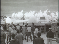 According to special effects assistant Koichi Kawakita and actor Takashi Shimura, Tsuburaya directed all of the scenes in which Maguma was involved rather than Honda. Assistant director of special effects Teruyoshi Nakano stated that Maguma was primarily portrayed by Katsumi Tezuka, while Haruo Nakajima wore the suit during the scene where Maguma is surrounded by the jet pipes.[12] However, Nakajima stated that he had no memory of playing Maguma.[13] Whoever was in the suit was exposed to the intense heat given off by the jet pipes. The staff tried painting his back with melted plaster, but it had no effect, and they resorted to using a different flame-retardant material.[11]