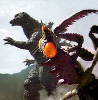 After Godzilla defeated Kumonga in New Guinea, he followed the Gotengo to Manazuru, where the Controller of Planet X deployed Kamacuras to fight against him. Kamacuras was teleported onto a bridge, but was forced to fly off after Godzilla caused a tidal wave after surfacing from the ocean, demolishing the bridge. Kamacuras then hid on a nearby mountainside, camouflaging among the foliage. However, this tactic did not work and Godzilla begin to unleash his atomic breath on the mountain, forcing the mantis to flee yet again. As Kamacuras flew towards Godzilla in an attempted ambush, the mantis was caught by the claw and Godzilla then threw Kamacuras into a transmission tower, impaling him as the insect began to writhe around before succumbing to his injury.
