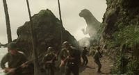 In 1944, the United States military invaded the Marshall Islands, eliminating the Japanese garrisons located there. After the Americans had seized the island of Kwajalein, the only Japanese garrison remaining was the one located on the small neighboring island of Lagos. The garrison, led by Major Yasuaki Shindo, refused to surrender despite constant bombardment from the American Navy, and planned a desperate last charge against the Americans. The Japanese garrison launched its attack early in the morning, but was overwhelmed by the American forces. However, a gigantic dinosaur emerged from the jungle, terrifying the American soldiers, who opened fire on it. The dinosaur retaliated, killing the soldiers and approaching the shore. There, it was seemingly brought down from being bombarded by nearby American battleships. As the American infantry approached, the dinosaur got back to its feet and trampled them to death. The dinosaur then returned to the jungles of the island, leaving the Americans in retreat and the Japanese garrison intact. Later, the wounded dinosaur collapsed in the jungle from its injuries. Shindo and his garrison surrounded the dinosaur, thanking it for saving their lives and saluting it before finally leaving the island.