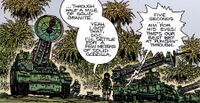 In 1967, the Anti-Megalosaurus Force followed Godzilla to Vietnam and prepared to test their new Maser Cannons against him, created by the eccentric but brilliant scientist Doc Randall. Though the Maser Cannons initially appeared to be effective against Godzilla by aiming for his eyes, Anguirus soon emerged from the ground beneath them, destroying most of the weapons in the process. Due to smoke left behind from an ineffective bombing run against Godzilla, the remaining Maser Cannons were unable to get another clear shot on the monster before he got away.