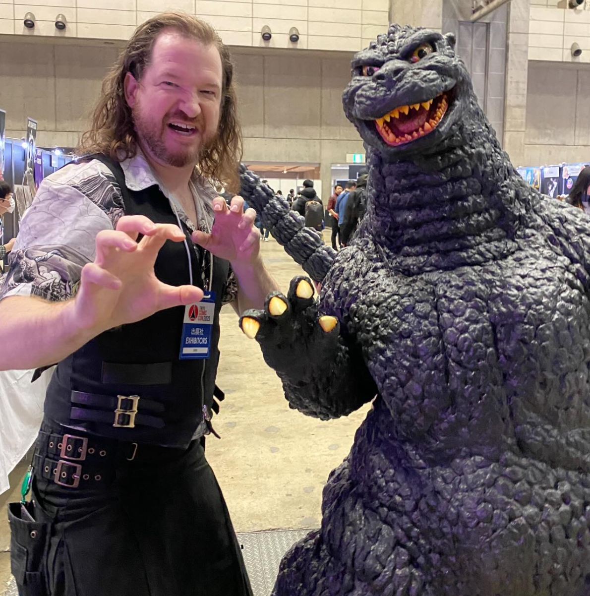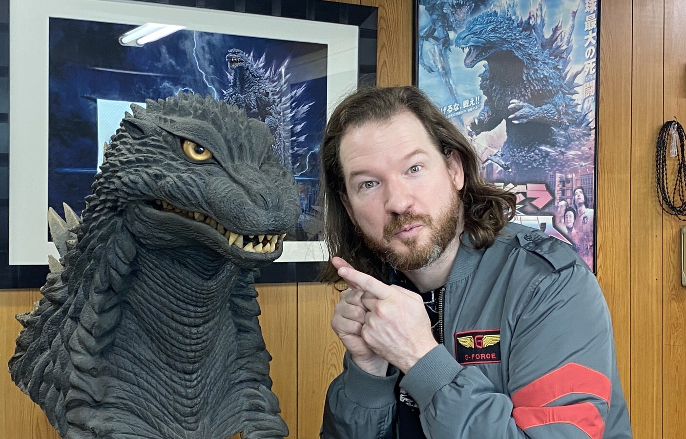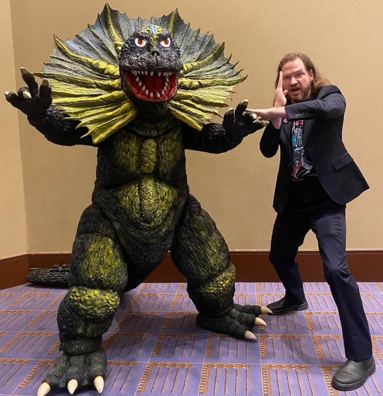 Matt Frank dressed for the Godzilla Minus One U.S. premiere, with a Bandai Movie Monster Series Godzilla 2023 figure on his shoulder