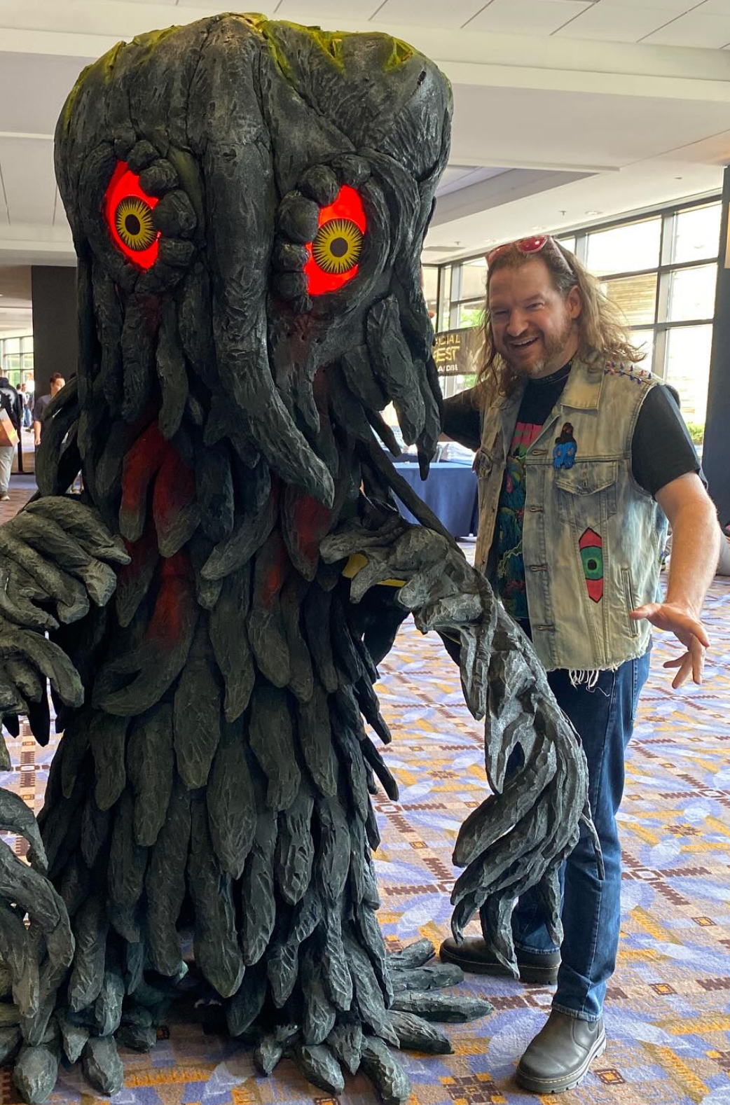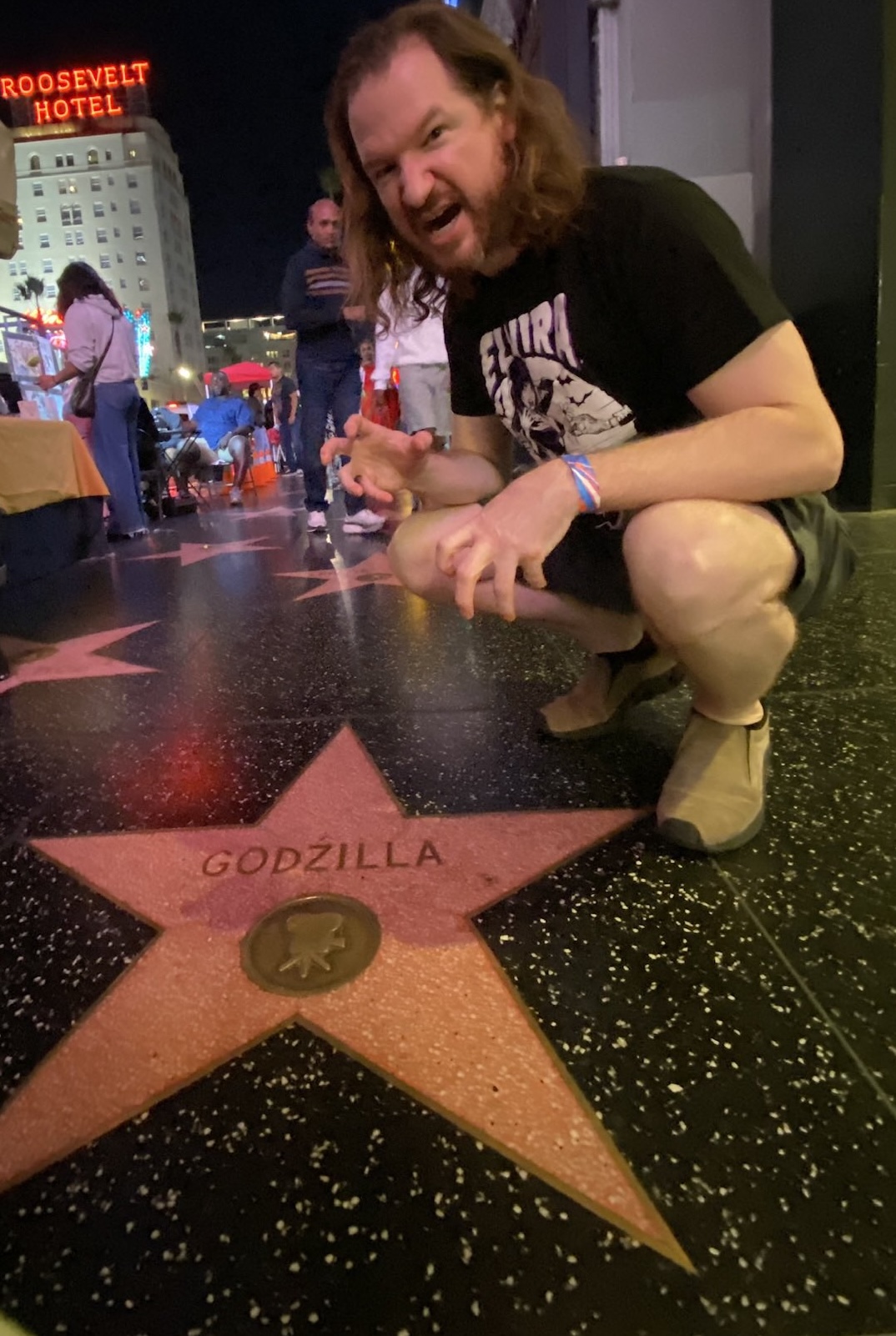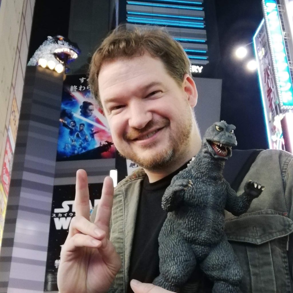 Matt Frank dressed for the Godzilla Minus One U.S. premiere, with a Bandai Movie Monster Series Godzilla 2023 figure on his shoulder