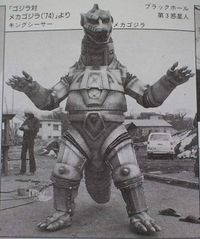 The creation of the Black Hole Planet 3 Aliens, Mechagodzilla was the centerpiece in their planned invasion of Earth. The magnificent machine was released from the crater of Mount Fuji wearing a Godzilla disguise, and made its way to Tokyo after dispatching Anguirus. Once it reached Tokyo, the impostor was attacked by the real Godzilla, who quickly revealed its true colors. Mechagodzilla was damaged in the ensuing fight with Godzilla, but was repaired and sent to destroy King Caesar at Okinawa. Godzilla returned and aided King Caesar, and together they were able to destroy Mechagodzilla. A year later, Mechagodzilla was rebuilt by the Black Hole Planet 3 Aliens and re-christened Mechagodzilla 2 (メカゴジラ2,   Mekagojira Tsū), and was unleashed on Tokyo once again, this time aided by the monster Titanosaurus, which was controlled by the deranged human scientist Dr. Shinzo Mafune. Godzilla rose to battle his robotic doppelganger a second time, but found himself badly outmatched against two foes. However, with the aid of humanity and the sacrifice of Katsura Mafune, Dr. Mafune's cyborg daughter, Godzilla was able to triumph once again.