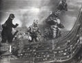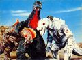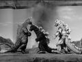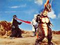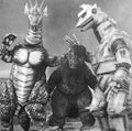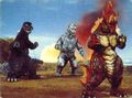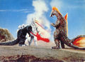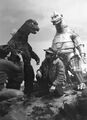 King Caesar rams into Mechagodzilla while Godzilla holds it onto him using his magnetic powers