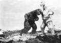 King Caesar runs toward Mechagodzilla while Godzilla holds it onto him using his magnetic powers