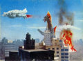 Mechagodzilla 2 destroying a street in Tokyo with its finger missiles