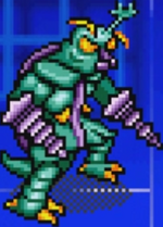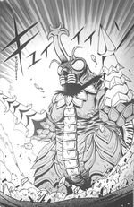 After Torema returned to the cave and helped Godzilla defeat Proto-Moguera and trick it into helping them escape the cave, Megalon and Destoroyah were ready to attack the pair as they escaped. Megalon and Destoroyah attacked Godzilla physically after Destoroyah fired an Oxygen Destroyer Ray at him, with Megalon briefly pausing to knock Torema's Panna Torte out of the sky by firing a bomb at it. After Destoroyah finally disabled the malfunctioning Proto-Moguera when it knocked all three of them over and interrupted the battle, Megalon continued to attack Godzilla alongside Destoroyah but were interrupted once again by Gigan's arrival. Torema despaired as to what would become of Godzilla in a three-on-one battle until Gigan surprised everyone by attacking Megalon instead and knocked him down with a single attack. After Gigan and Godzilla dealt with Destoroyah, they dragged the evil monsters into the cave and trapped them by causing a cave-in of their own with their beam attacks.