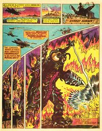In the American promotional comic produced by Cinema Shares for Godzilla vs. Megalon, Megalon is depicted as not being Seatopian in origin, but rather appearing from beneath the Earth during an undersea eruption, and coming to attack cities to satisfy his "Energy Hunger." He is killed brutally by Godzilla after having the back of his spine bitten into.