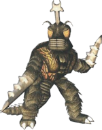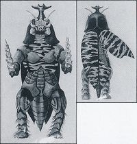 The inspiration for Megalon came from Gebara (ゲバラ), a giant mole cricket kaiju that was conceptualized as the villain for All Monsters Attack.[7] During production, Gebara was reworked into a mutant toad and renamed Gabara.[8] The original concept for Gebara was revived during production of the thirteenth Godzilla film, with its design reworked and rechristened "Megalon," a name originally used for a kaiju from the unmade 1972 Godzilla film Godzilla vs. the Space Monsters: Earth Defense Directive, who would have fought alongside Gigan and King Ghidorah under the command of the evil alien brain Miko against Godzilla, Anguirus, and the living statue Majin Tuol. In Shinichi Sekizawa's draft for this film, Megalon was described as moving quickly and expelling a gaseous smog from its body, while in Kaoru Mabuchi's treatment he was said to possess eyes on the ends of his antennae.[8]