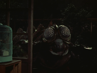 The mounting deaths and Goro's still-unknown whereabouts prompted suspicion that the missing miner was in fact behind the series of killings. This suspicion was quickly dismissed when one of the Meganulon ventured out of the mine and entered the local mining village. The Meganulon attacked Goro's surviving sister, Kiyo, and her fiance, Shigeru, who fled to get help. Shortly after, the police arrived on the scene and ineffectively opened fire at the giant insect with their handguns while it bid a hasty retreat back to its lair. The police were quick to pursue the creature toward the mountain and continue firing at it, but their gunshots had no effect against the thick carapace of the ravenous insect. The Meganulon pounced and killed two officers who advanced too close before returning to the mine shaft, killing more innocents along the way.