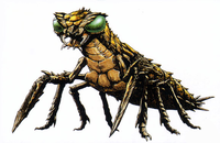 The Meganula is mostly a brown color, with a red line running down its spiky back. The Meganula has blue compound eyes, reminiscent of the original Meganulon design. The Meganula's mouth consists of white chelicerae and white fangs. It also sports four foggy, transparent wings, as well as a pair of forewings and hindwings that are quite large. It has a thin, long body with segments that allow for a lot of flexibility. The Meganula has a pair of very thin and long mantis-like scythes on its forelimbs, as well as two pairs of legs. At the end of its body, it possesses a stinger.