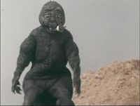 Minilla's face was patterned after the character Chibita from the popular manga Osomatsu-kun published by Shogakukan in Weekly Shonen Saturday at the time. The Minilla suit's head and body were modeled by Teizo Toshimitsu[11] and Yasuei Yagi, respectively. In addition to the suit, a 2-shaku (Japanese foot) model was created to portray the newborn Minilla.[1] The suit was worn by professional wrestler and entertainer Masao "Little Man Machan" Fukazawa, who had difficulty moving in the suit due to its body shape. This caused Fukuzawa to walk with a wobbly gait and meant he was unable to stand back up by himself whenever he fell over in the suit. However, director of special effects Sadamasa Arikawa was pleased with this effect, believing Fukazawa's performance perfectly embodied a toddler. Initially, Arikawa wanted Minilla's atomic breath to curve vertically through the air like a shuriken, but Eiji Tsuburaya advised him to have Minilla breathe smoke rings instead. Effects animation of Minilla firing the shuriken-inspired heat ray at Kamacuras were completed but ultimately unused.