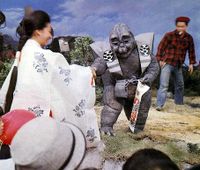 Filming takes place for the sequence in which Kumonga captures and nearly kills Minilla