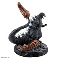 This polystone/resin statue depicts Godzilla as he appears in Godzilla: Tokyo SOS, battling the two Mothra Larva with one of Kiryu's railguns lying on the ground in front of them. It has a 15 inch base diameter, with the statue itself being 17 inches wide, 16 inches tall with no attachment, and 20 inches tall with the Larva attached. The figure includes the two larva; swappable Godzilla jaws, including a closed jaw, a jaw with Mothra Imago's leg in it, and a head firing atomic breath; and a swappable tail tip for the attachable larva.