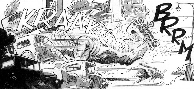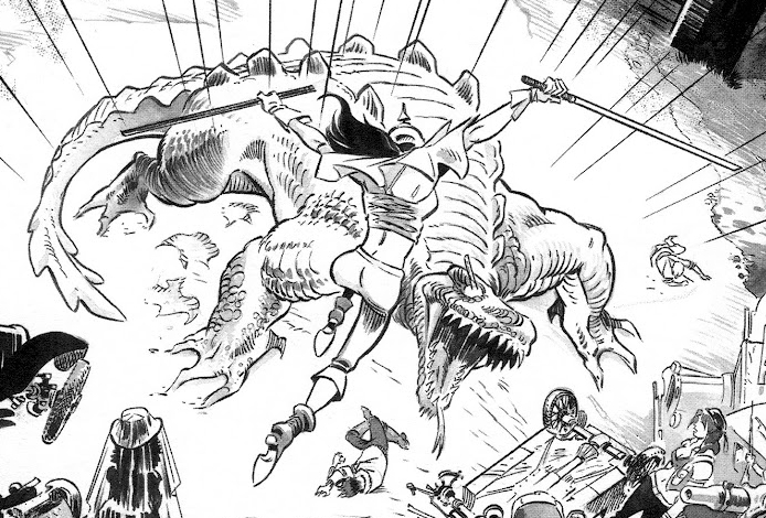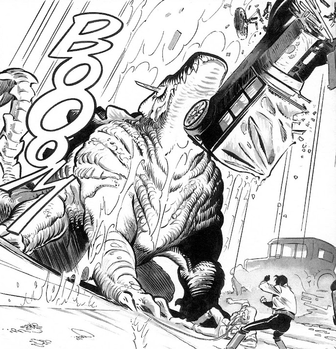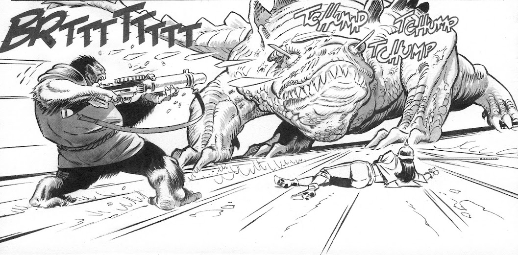 When Virgil Price and Kurt Conrad were thrown into the Amazons' arena outside of Central Park, the Amazon Queen Damara was impressed when Price used the knife to cut the rope tying the men together instead of taking Kurt's life. Not to be outdone, she ordered the release of Mongo. He charged into the arena, throwing automobiles aside as he ran toward the men. Kurt became trapped under one of the cars, and Mongo prepared to strike, but Virgil tipped one car from on top of a pile onto Mongo's head. Believing him to be out for the count, Virgil ran to Kurt's aid, and Mongo threw the car off and reared up at them. Damara then leaped into the arena and slashed Mongo with her sword, which barely fazed the beast. He knocked the queen to the ground, and her gorilla bodyguard came down from above to defend her. She gave the order to kill the monster, and the gorilla let loose many rounds into Mongo's snout and flank. She made a brief challenge to her followers to see if anyone disapproved of her actions, and when they all were silent, she ordered them to find her "a new Mongo".