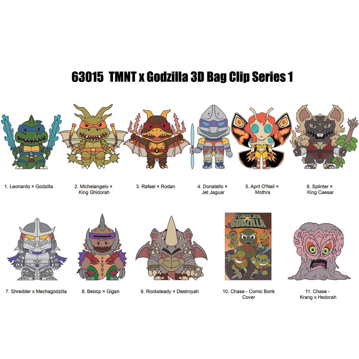 In January 2026, Monogram International revealed a set based upon the 2025-2026 IDW Publishing comic Teenage Mutant Ninja Turtles x Godzilla. The figural bag clips includes: