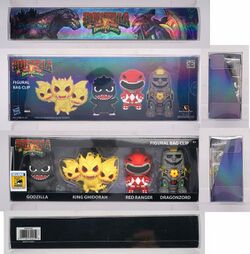 In 2022, Monogram International released a set of four figural bag clips of characters featured in the IDW Publishing and BOOM! Studios crossover comic Godzilla vs. The Mighty Morphin Power Rangers, sold exclusively at San Diego Comic Con. The Godzilla and King Ghidorah clips are both from Godzilla Classic Series 1, while the Red Ranger is from a 2017 Power Rangers set. The Dragonzord clip is exclusive to this set. The contents include: