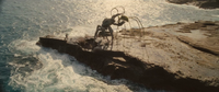 During Monarch's ill-fated expedition to Skull Island in 1973, a Mother Longlegs chased Bill Randa out of the bamboo forest and to the edge of a small cliff overlooking the ocean. With nowhere to go and the monster approaching quickly, he decided to throw his bag in the water so it could be discovered after his demise. Before the giant spider could kill him, however, the Mantleclaw emerged from the ground and roared at the Mother Longlegs, prompting the two arthropod monsters to fight. The Mother Longlegs jabbed the Mantleclaw in the eye with one of her legs, only to lose the limb to the crab-like monster's claw. The Mother Longlegs retaliated by pushing it off the cliff and fell in after it, while Randa was narrowly able to avoid their clashing and survived.